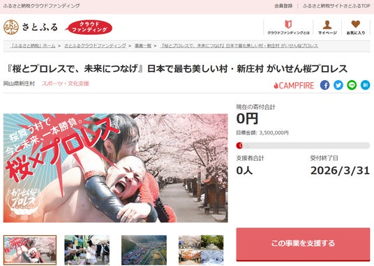 岡山県新庄村とふるさと納税ポータルサイト「さとふる」を運営する株式会社さとふる(本社:東京都中央区、代表取締役社長 兼 CEO:藤井 宏明)は、「さとふるクラウドファンディング」にて、「『桜とプロレスで、未来につなげ』日本で最も美しい村・新庄村 がいせん桜プロレス」の寄付受け付けを2026年2月2日より開始します。