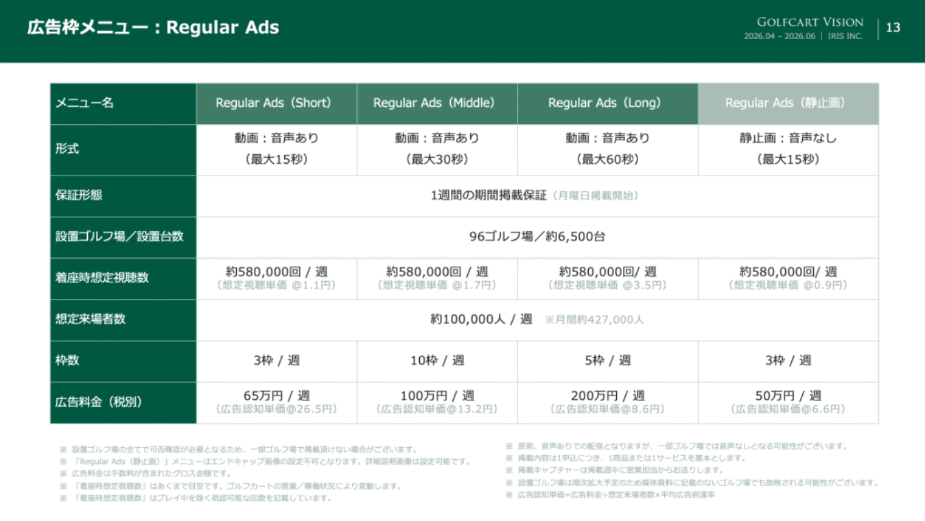 株式会社IRIS(本社:東京都港区、代表取締役:眞井 卓弥・戸田 鉄平、以下IRIS)と、ゴルフカートナビ国内導入実績約1,300コース(※1)の株式会社テクノクラフト(本社:新潟県新潟市、代表取締役:栂坂 昌業、以下テクノクラフト)が共同で運営するゴルフカートメディア「Golfcart Vision」は、2026年4月-6月の媒体資料を本日公開しました。