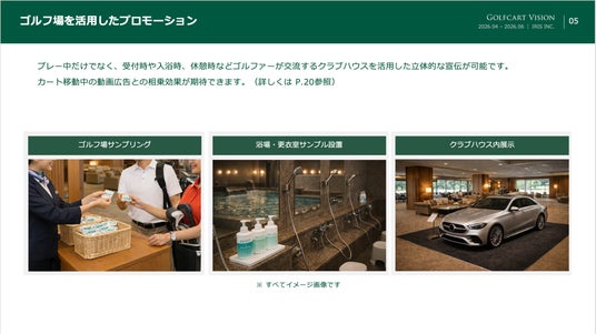 ● 主なメニュー例:受付でのサンプリング、浴場・更衣室へのアメニティ設置、クラブハウス内での車両や製品の展示など。