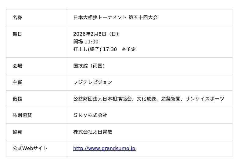 Sky株式会社は、2026年2月8日(日)に開催される「日本大相撲トーナメント 第五十回大会」に特別協賛いたします。