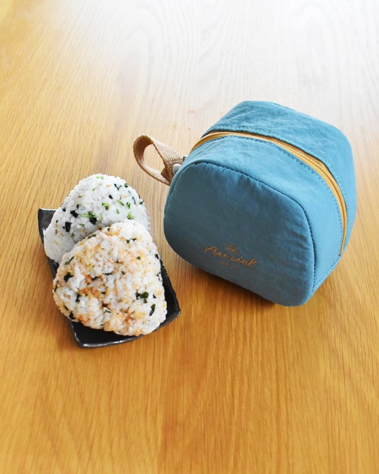 1. コンビニおにぎり2個を持ち運びできるポーチ。内側はアルミ蒸着シート加工。保冷・保温効果を補助します。