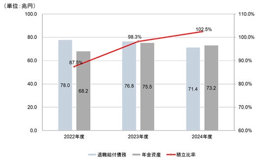 ・合計値における積立比率(年金資産/退職給付債務)は102.5%と、前年度(98.3%)に比べ4.2%ポイント上昇