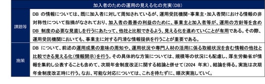 - 「見える化」の目的は、単なる数値比較にとどまらず、企業年金の制度・運営状況を多様なステークホルダーにわかりやすく示し、背景や意図を踏まえた情報提供を通じて、制度の信頼性と持続性を高め、加入者・受給者の最善の利益を実現することにあります