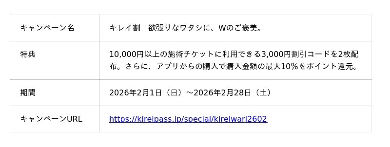 「キレイパス byGMO」では、大型キャンペーン「キレイ割」を2026年2月1日(日)から2月28日(土)まで開催中です。人気の施術をお得に体験できるこの機会に、ぜひご利用ください。
