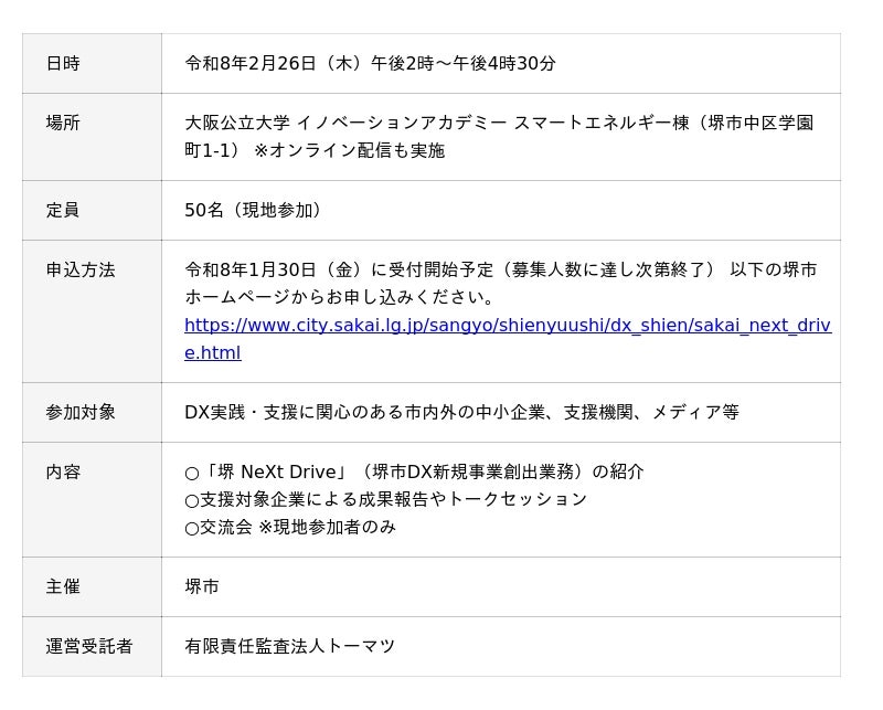 ナカバヤシ株式会社(本社:大阪市中央区、社長:中林一良)は、堺市が実施するデジタル技術を活用した新規事業創出・ビジネス変革支援プログラム「堺 NeXt Drive(堺市DX新規事業創出業務)」の成果報告会に登壇し、当社の取組内容を発表します。