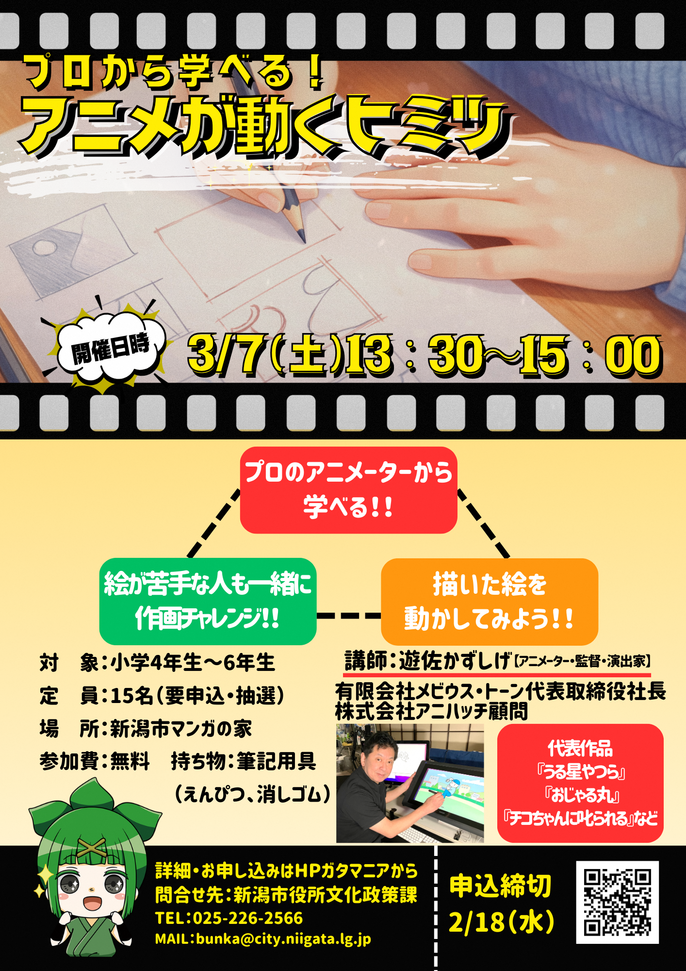 専門道具や専門知識は必要なし。絵が得意な人もそうでない人も楽しめる講座内容です!アニメを見るのが好きな小学4年生から6年生のみなさん、たくさんのご応募をお待ちしております!