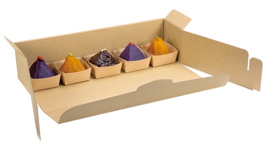 環境保護機関の認証を受けた未晒しクラフト紙を使用した、3サイズ展開のクラフト紙トレーシリーズ。ケーキ、和菓子、焼菓子と幅広く対応します。