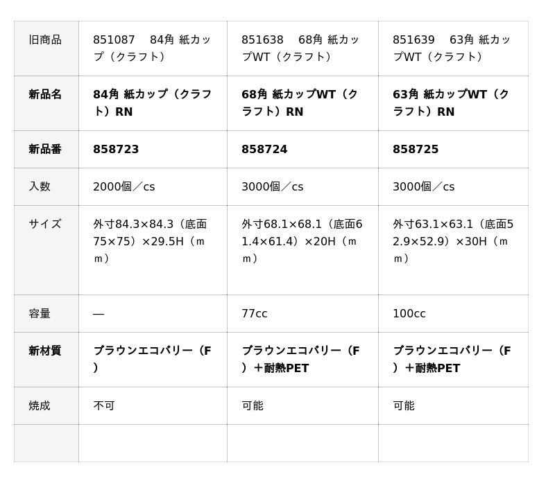 株式会社 東光(本社:東京都品川区、代表取締役社長:高久 仁男)は、和洋菓子店さま向けBtoB販売の菓子用包材紙カップ『84角 紙カップ(クラフト)』『68角 紙カップ(クラフト)』『63角 紙カップ(クラフト)』の3商品について、原紙をフッ素系の”ブラウン耐水耐油紙”から、ノンフッ素耐油紙・ノーコート未晒アイボリー(裏面特殊樹脂塗工)の“ブラウンエコバリー(F)”へ、2026年2月より順次変更いたします。