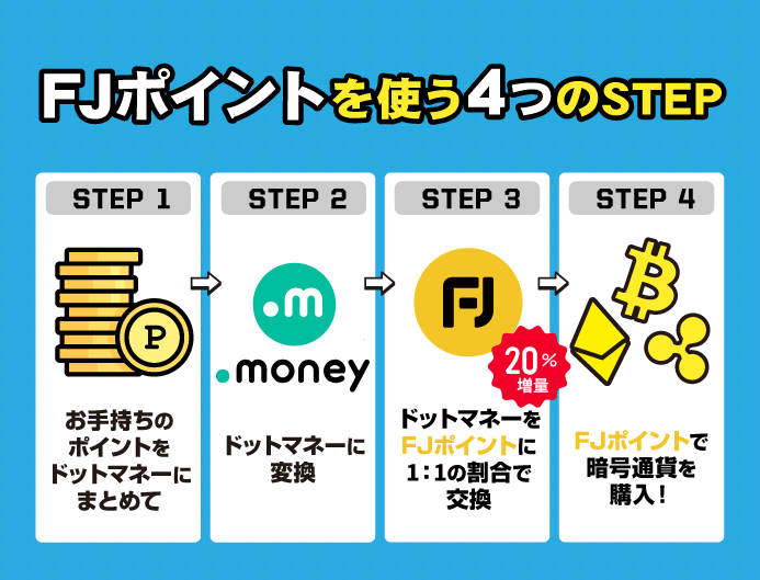 「ドットマネー( https://d-money.jp/ )」にアクセスし、「マネーを使う」から暗号資産交換ポイント「FJポイント」を選択し交換してください。