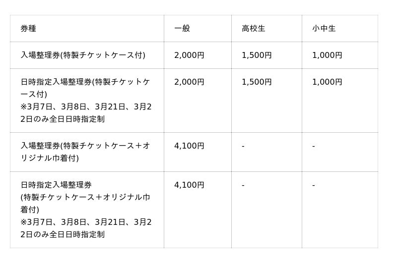 販売券種:「日時指定入場整理券(特製チケットケース付)」「日時指定入場整理券(特製チケットケース+オリジナル巾着付)」