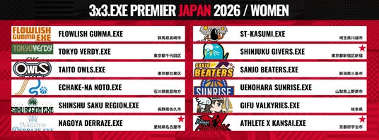 『3x3.EXE PREMIER 2026 JAPAN』の男子カテゴリーには、日本国内で5チーム、シンガポールから 初めて1 チームが参戦します。また、女子カテゴリーには3チームが新加盟し、昨シーズンの全9チームから全12チームに拡大いたしました。男女ともにより熾烈な戦いが予想される2026シーズンに、ぜひご注目ください。