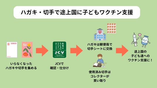 「認定NPO法人 世界の子どもにワクチンを 日本委員会」(東京都、以下JCV)では、ご自宅やオフィスに眠っている、未使用・書き損じハガキ・未使用切手や使用済み切手を回収し、途上国の子ども達を感染症から守る、ワクチン支援につなげています。