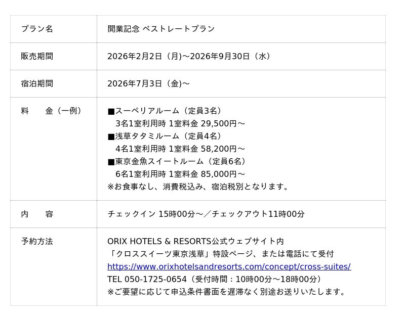 ORIX HOTELS & RESORTS(運営会社:オリックス・ホテルマネジメント株式会社、本社:東京都港区、取締役社長:似内 隆晃)が展開する、新たなライフスタイル・アパートメントホテルブランド「CROSS Suites」一号店となる「クロススイーツ東京浅草」を2026年7月3日(金)に開業します。これに先立ち、本日2026年2月2日(月)より宿泊予約の受付を開始します。