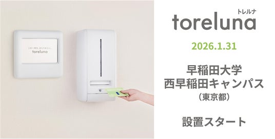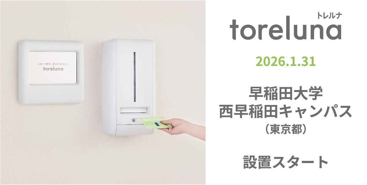 株式会社ネクイノ(大阪市北区、代表:石井 健一)は、トイレの個室で生理用ナプキンを常備し無料で提供するサービス「toreluna(トレルナ)」(以下 トレルナ)を、早稲田大学 西早稲田キャンパスへ設置し、サービスの提供を開始いたしました。
