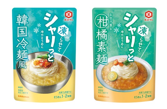 「キッコーマン シャリっと冷やそうめん」は、商品を凍らせて使う新感覚のめんつゆです。商品を袋のまま8時間以上冷凍し、冷凍庫から出して袋のまま5分ほど常温で戻すと、シャリシャリとしたシャーベット状のつゆが楽しめます。濃厚な牛テールの風味と国産野菜だしのうま味が特徴の「韓国冷麺風」と、しいたけ・昆布・鰹節のだしにシークヮーサーの風味を効かせた「お出汁香る柑橘素麺」の、全部で2つのラインアップです。