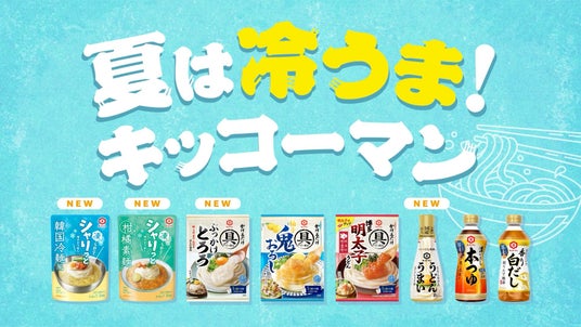 動画に登場の商品は、凍らせる新感覚のめんつゆ「キッコーマン シャリっと冷やそうめん 韓国冷麺風」、かけるだけでおいしい「キッコーマン うどんがうまいだししょうゆ」「キッコーマン 具麺 柚子鬼おろし」、氷を入れたぶっかけ麺にもおすすめの「キッコーマン 濃いだし 本つゆ」「キッコーマン 旨みひろがる 香り白だし」の全部で5商品です。