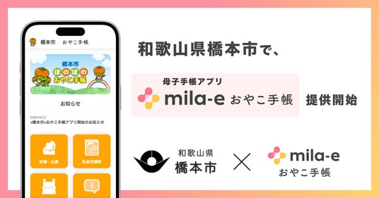 自治体向けサービスを開発する株式会社ミラボ(本社:東京都千代田区、代表取締役:谷川一也、以下「ミラボ」)の母子手帳アプリ「mila-e(ミライー) おやこ手帳」が、和歌山県 橋本市に導入され、「橋本市 ほのぼの おやこ手帳」として 提供を開始しました。
