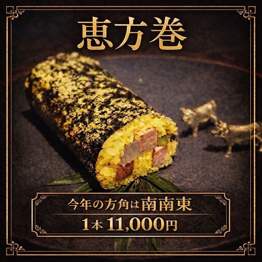 一本丸ごと金箔で仕上げることで、味覚のみならず視覚的にも非日常性を演出した、年に一度だけの特別な恵方巻です。価格は 11,000円(税込)。