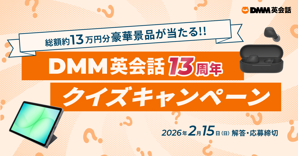 XでDMM英会話アカウントをフォローし、英語クイズに回答すると、抽選で総額約13万円相当の賞品をプレゼントいたします。
