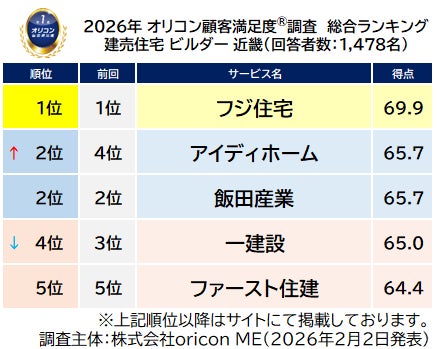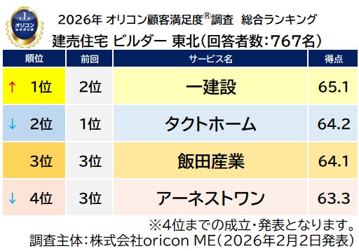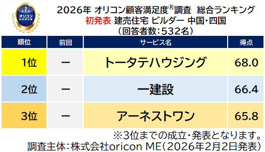 オリコン株式会社(本社:東京都港区 代表取締役社長:小池 恒、略称:オリコン)は、グループ会社である株式会社oricon MEが、実際のサービス利用者を対象に第三者の立場で実施した『建売住宅 ビルダー』の顧客満足度調査の結果を、2026年2月2日(月)14時に「オリコン顧客満足度(R)」公式サイト内にて発表いたしました。ランキングの結果は、下記の通りとなりました。