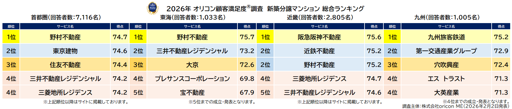 2026年 オリコン顧客満足度(R)調査 新築分譲マンション(首都圏/東海/近畿/九州)