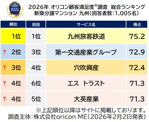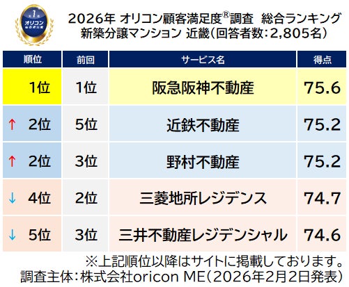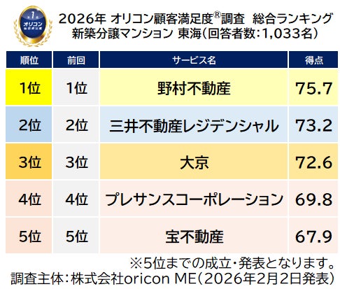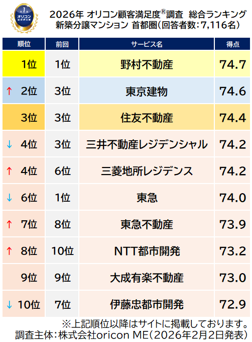 オリコン株式会社(本社:東京都港区 代表取締役社長:小池 恒、略称:オリコン)は、グループ会社である株式会社oricon MEが、実際のサービス利用者を対象に第三者の立場で実施した『新築分譲マンション』の顧客満足度調査の結果を、2026年2月2日(月)14時に「オリコン顧客満足度(R)」公式サイト内にて発表いたし ました。ランキングの結果は、下記の通りとなりました。