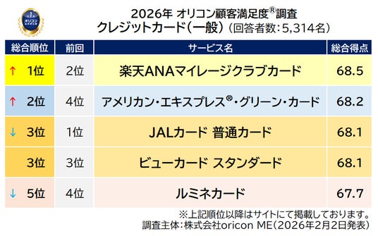 オリコン株式会社(本社:東京都港区 代表取締役社長:小池 恒、略称:オリコン)は、グループ会社である株式会社oricon MEが、実際のサービス利用者を対象に第三者の立場で実施した『クレジットカード』についての顧客満足度調査の結果を、2026年2月2日(月)14時に発表いたしました。