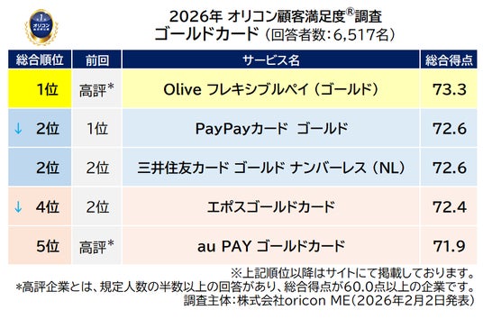 2026年 オリコン顧客満足度(R)調査 ゴールドカード ランキング総合結果