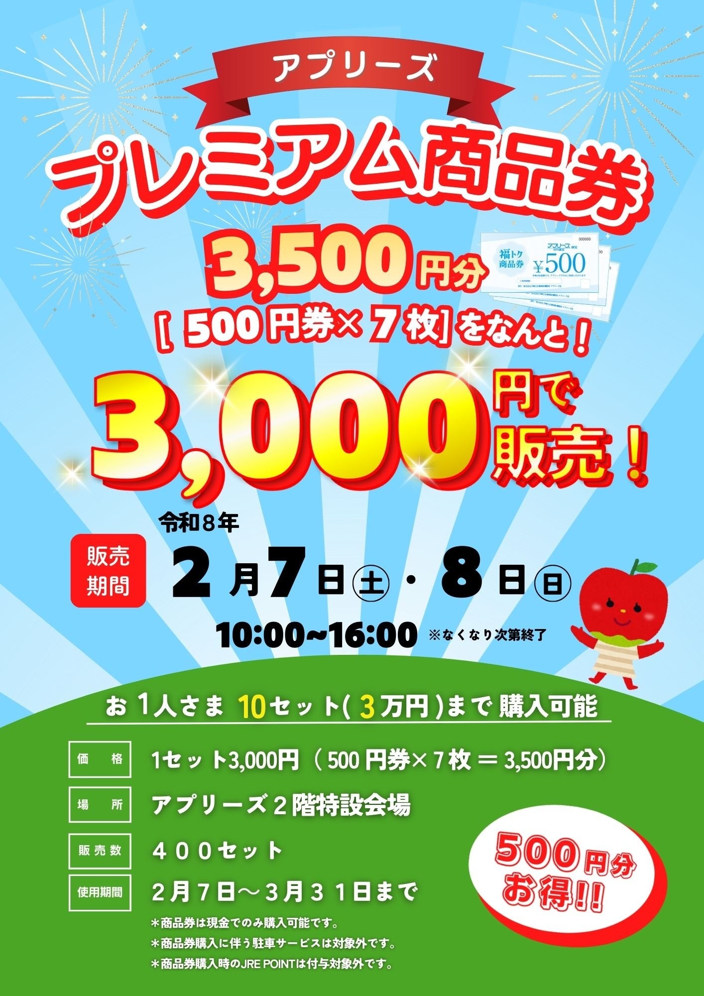 弘前駅ビル アプリーズでは、3,000円で3,500円分のお買い物ができる、お得な『プレミアム商品券』を数量限定販売します!
