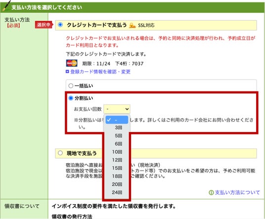 これまで、「楽天トラベル」における国内宿泊ならびに「ANA楽パック」「JAL楽パック」のクレジットカード決済は一括払いのみに対応していましたが、このたび3回、5回、6回、10回、12回、15回、18回、20回、24回払いの分割払いが選択できるようになりました。なお、分割払いの利用には手数料がかかります(注2)。