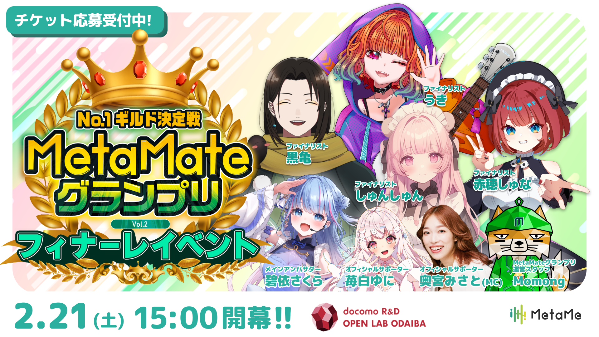 2025年10月の参加者募集オーディションに始まり、12月の1stステージ、2026年1月の2ndステージと、約4ヶ月にわたりファンと共に歩んできた本イベント。2代目「MetaMate」の称号を手にするのは誰になるのか。最終決戦となるフィナーレイベントのチケットは現在応募受付中です。ぜひ、夢を掴む瞬間を会場で見届けてください。