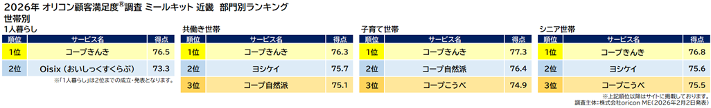 『ミールキット 近畿』部門別ランキング(2026年 オリコン顧客満足度(R)調査)