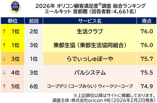 『ミールキット 首都圏』総合ランキング(2026年 オリコン顧客満足度(R)調査)