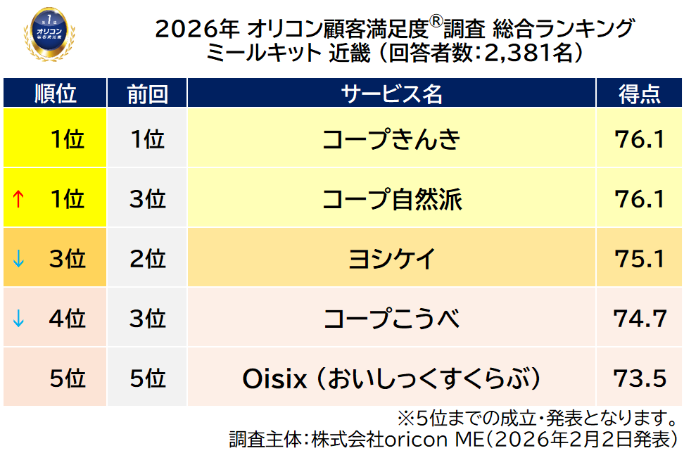 『ミールキット 近畿』総合ランキング(2026年 オリコン顧客満足度(R)調査)