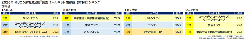『ミールキット 首都圏』部門別ランキング(2026年 オリコン顧客満足度(R)調査)