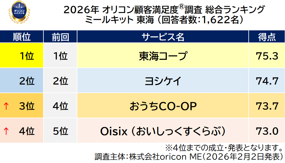 『ミールキット 東海』総合ランキング(2026年 オリコン顧客満足度(R)調査)