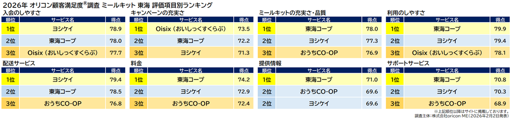 『ミールキット 東海』評価項目別ランキング(2026年 オリコン顧客満足度(R)調査)