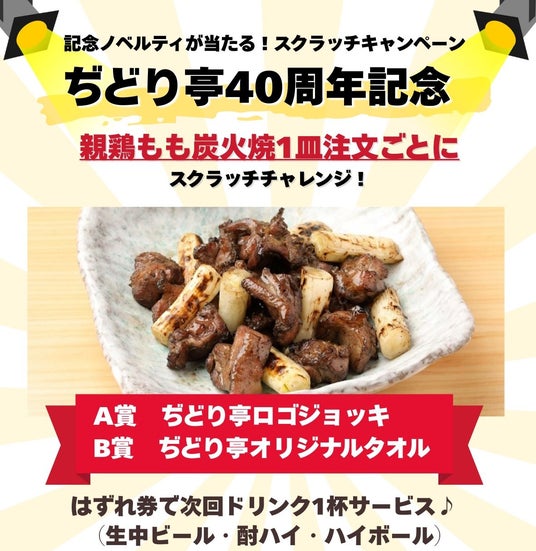 記念ノベルティが当たる!スクラッチキャンペーンぢどり亭の看板メニュー【親鶏もも炭火焼】を一皿ご注文ごとに、40周年を記念したオリジナルロゴジョッキなどの記念品が当たるスクラッチチャレンジを実施します!