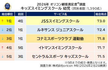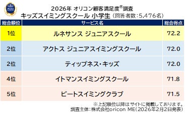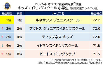 オリコン株式会社(本社:東京都港区 代表取締役社長:小池 恒、略称:オリコン)は、グループ会社である株式会社oricon MEが、実際のサービス利用者を対象に第三者の立場で実施した、『キッズスイミングスクール 幼児/小学生』についての顧客満足度調査の結果を、2026年2月2日(月)14時に「オリコン顧客満足度(R)」公式サイト内にて発表いたしました。( https://life.oricon.co.jp/ )