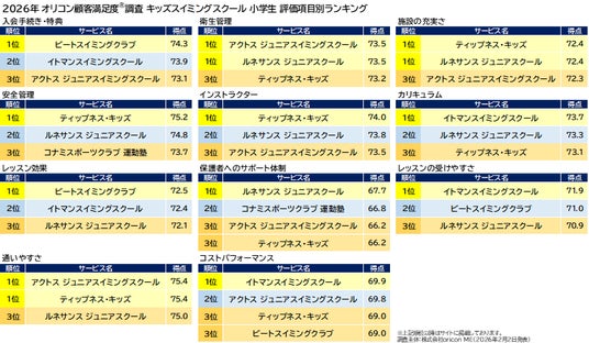 『キッズスイミングスクール 小学生』評価項目別ランキング(2026年 オリコン顧客満足度(R)調査)