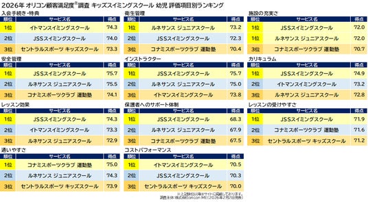『キッズスイミングスクール 幼児』評価項目別ランキング(2026年 オリコン顧客満足度(R)調査)