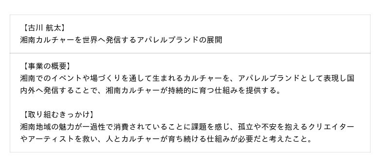 神奈川県が取り組む、起業準備者、起業家、地域企業が集まり、交流や相互支援により、地域「発」の起業家を生み出す「起業家コミュニティ」の形成を目指す取組です。