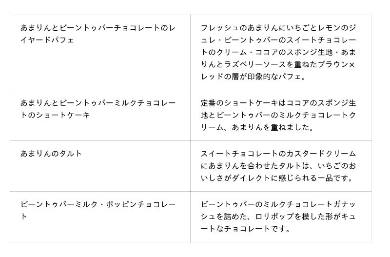 都会の中でも自然豊かな御殿山で、四季の移ろいを感じながらお楽しみいただく東京マリオットホテルのアフタヌーンティー。3~4月は、練乳いらずといわれるほど甘みが強いブランドいちご「あまりん」と、ホテルでカカオマスから製造を手掛けるビーントゥバーのチョコレートを主役に据え、それぞれの味わいを存分に堪能するスイーツ・セイボリーがテーブルに並びます。スイーツにはすべてビーントゥバーのチョコレートを使用し、「あまりん」のおいしさをダイレクトに感じられるパフェやタルトなど8品がラインナップ。ビーントゥバーのチョコレートは香りや味わいにこだわり、マダガスカル産・コロンビア産をブレンドし62%と高めのカカオ分を含有するスイートチョコレートや、ガーナ産・パナマ産のカカオをブレンドしたミルクチョコレートをホテルで一から製造。甘くみずみずしい「あまりん」とのマリアージュをお届けいたします。セイボリーはレッドカラーが目をひくミネストローネやトリュフがリッチに香るローストビーフのサンドウィッチなど4品をご用意いたしました。