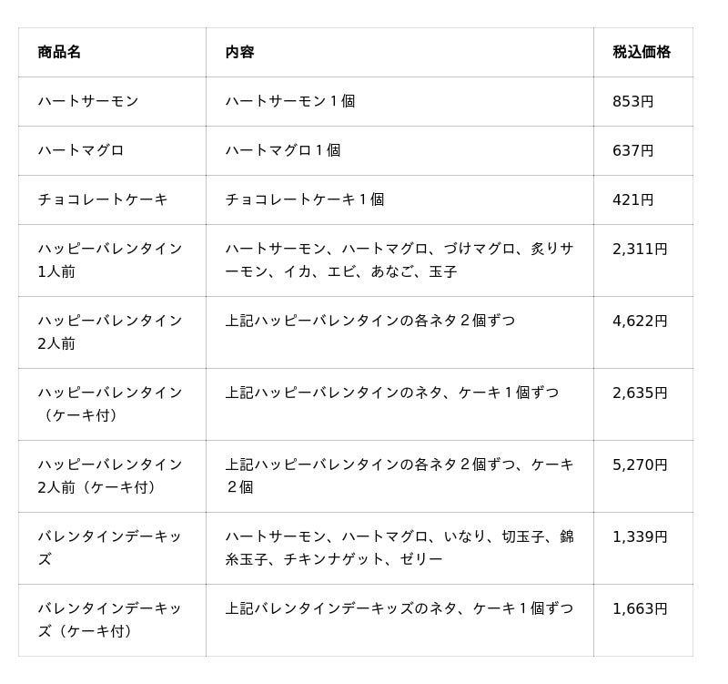 『ハッピーバレンタイン(ケーキ付)』:「お寿司+ケーキ」のセットを1人前、2人前でそれぞれ選べるため、大切な人や家族と囲む食卓に最適です。彩り豊かなお寿司が、感謝を伝える特別な時間を賑やかに盛り立てます。