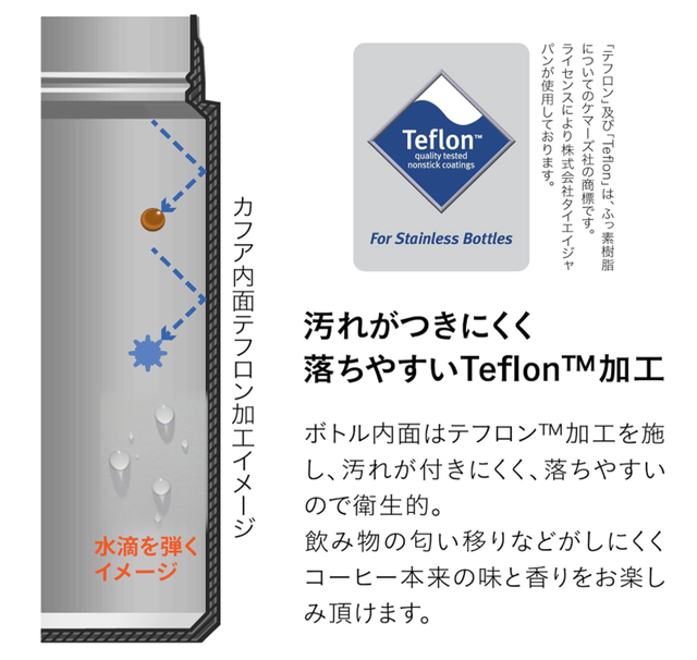 ボトル内面にはテフロン加工が施されており、コーヒーの匂い移りや汚れがつきにくく、本来の味と香りを楽しめます。