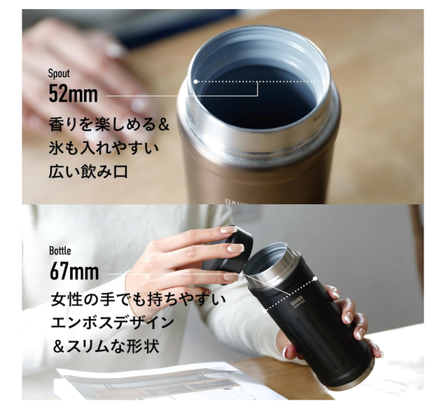 飲み口は53mmと広めに設計されており、コーヒーカップで飲むときのような豊かな香りを感じながら飲めるのが特徴。氷も入れやすいので、アイスコーヒーを入れるのにも便利ですよ。