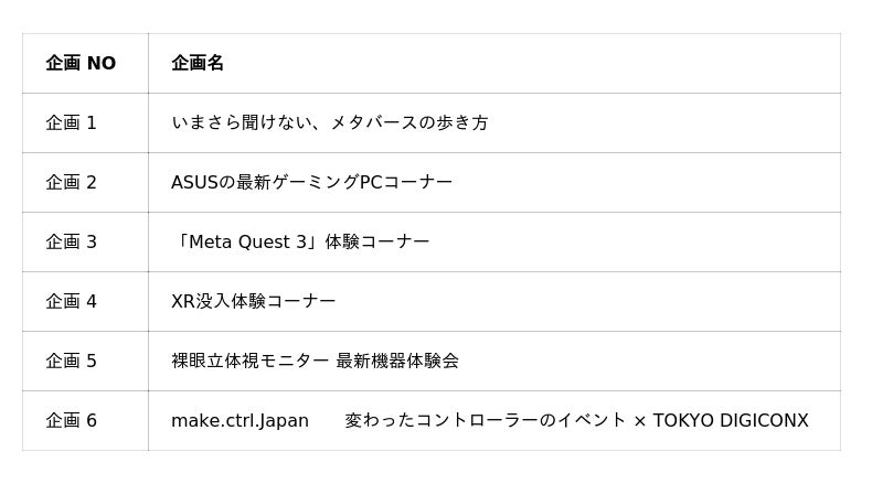 会場では、XR・メタバース・コンテンツ等の裾野を拡大することをコンセプトとして、来場者が参加可能な6種類の体験企画コーナーを設置しました。体験企画は、初心者から参加できるメタバース講座から、最新のVRヘッドセットが体験できる「Meta Quest 3/3S」体験コーナーまで、多くの来場者が参加されました。また、パブリックデイには、お子様や学生も楽しめるASUSの最新ゲーミングPCコーナー等に活気がありました。