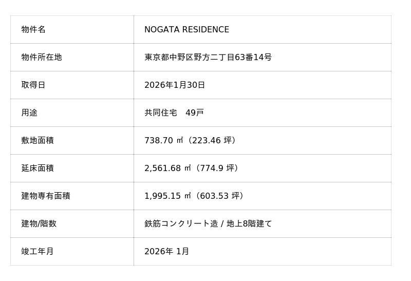 株式会社西武不動産(本社:東京都豊島区、代表取締役社長:齊藤 朝秀)は、下記のとおり資産(信託受益権)を取得しましたのでお知らせいたします。