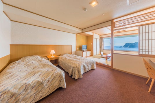 海を見ながらゆったりと寛げる和室とツインベッドが付いた洋室。和と洋の融合した広々とした空間でごゆっくりとお寛ぎください。