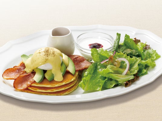 【ブレックファスト】エッグベネディクトパンケーキ(サラダ・ヨーグルト付) 1,380円(税込1,518円)小さめのロイヤルホスト伝統のパンケーキに、ベーコンとアボカドを重ね、爽やかな酸味とコクのあるオランデーズソースをのせました。ソースが全体をまとめバランスのよい味わいです。お好みでパンケーキシロップをかけてお召し上がりください。サラダ、ブルーベリーヨーグルト付きです。
